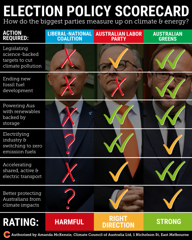 The Liberal-National Coalition voted against every law to cut climate pollution in the past three years. Their election policies would turbocharge coal, oil and gas pollution by at least 6.3 billion tonnes, putting more Australians in harm’s way. When comparing our biggest parties, the Climate Council found the Liberal-National Coalition ranks the worst on climate change, while Labor is heading in the right direction, and the Greens have strong climate policies.