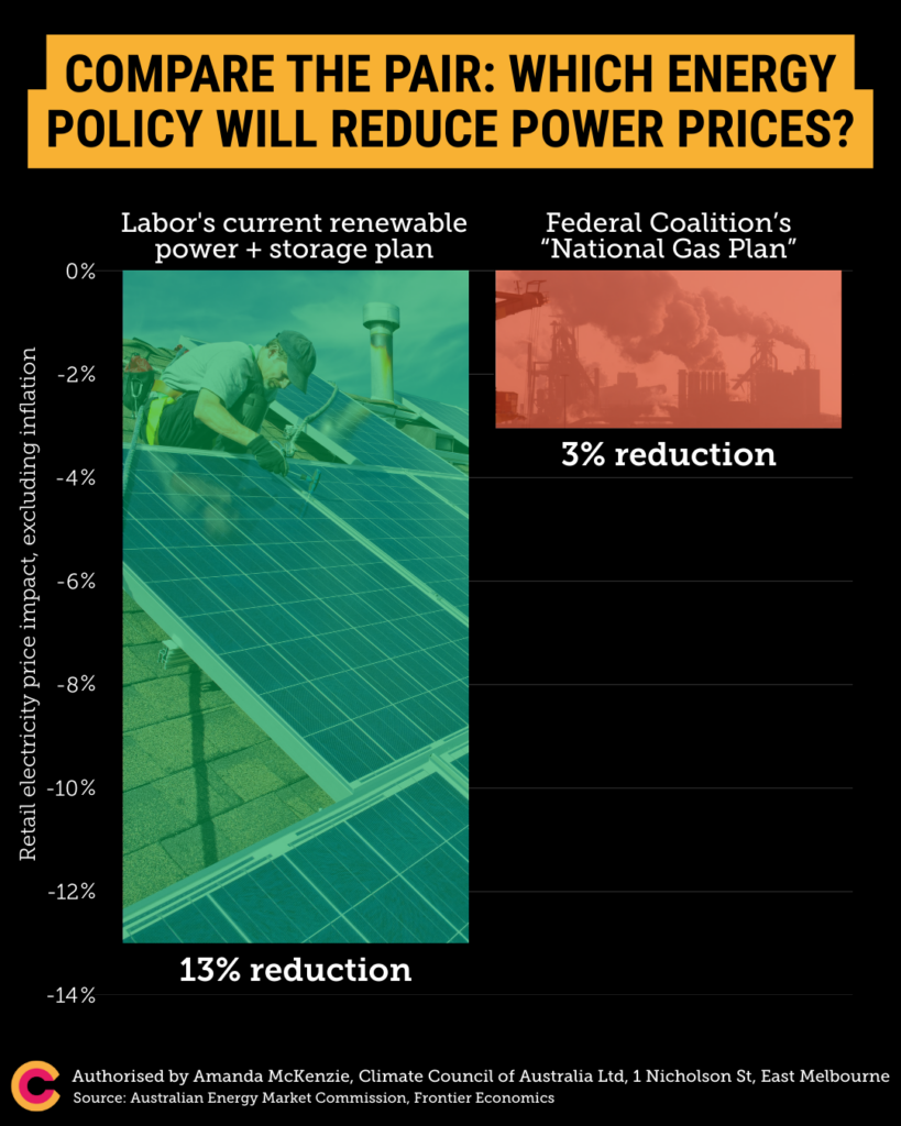 Coal-fired power stations are on the way out, and we need to replace them fast – before the lights go out and our kids’ futures goes up in smoke. CSIRO studied all the options, and found the lowest-cost way to do that in Australia is with solar and wind, backed by storage vs the highest-cost option, which is nuclear. We can’t say for sure that power prices will come down, because there are countless factors that impact our bills, like inflation. But we do know that renewables backed by storage are our best shot at bringing costs down.