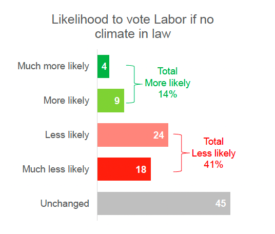 - 44% of Labor voters say they’d be less likely to vote Labor if the Government does not address climate change in the new law.