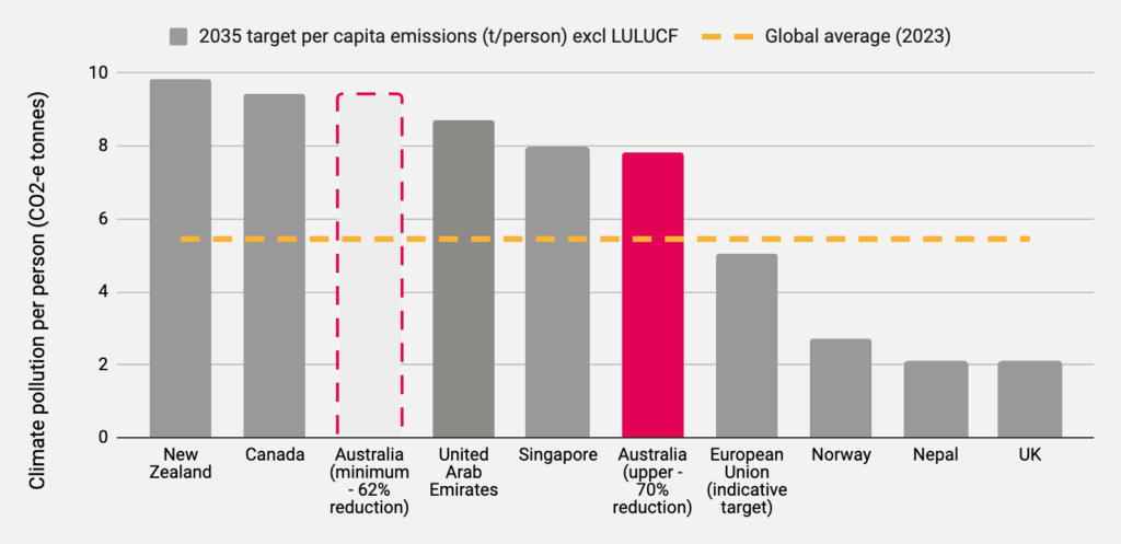 At a 2035 climate target within the 62-70% range, Australia’s climate pollution will still be amongst the highest in the world, and almost double the current emissions per person globally. Australia’s emissions target would be higher than nations in Europe and Asia, and far exceeding many low-income nations.