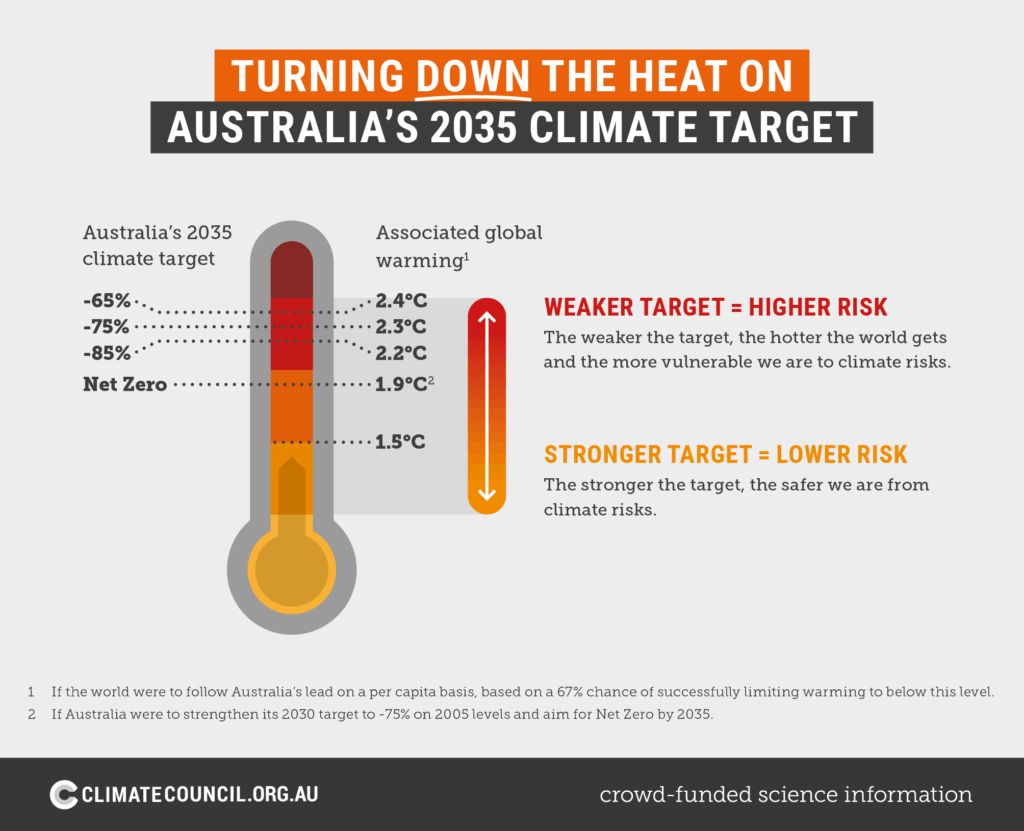- Contribute to keeping heating well below 2ºC above pre-industrial levels, after which climate impacts become especially catastrophic and severe. To have a strong chance of meeting this goal, Australia would need to set a net zero target for 2035.