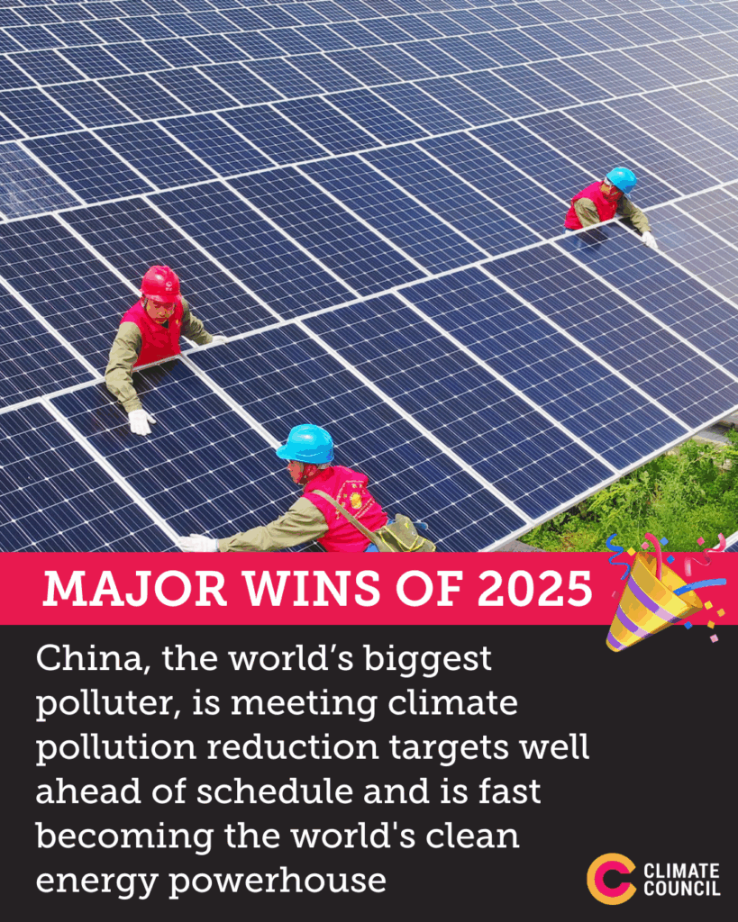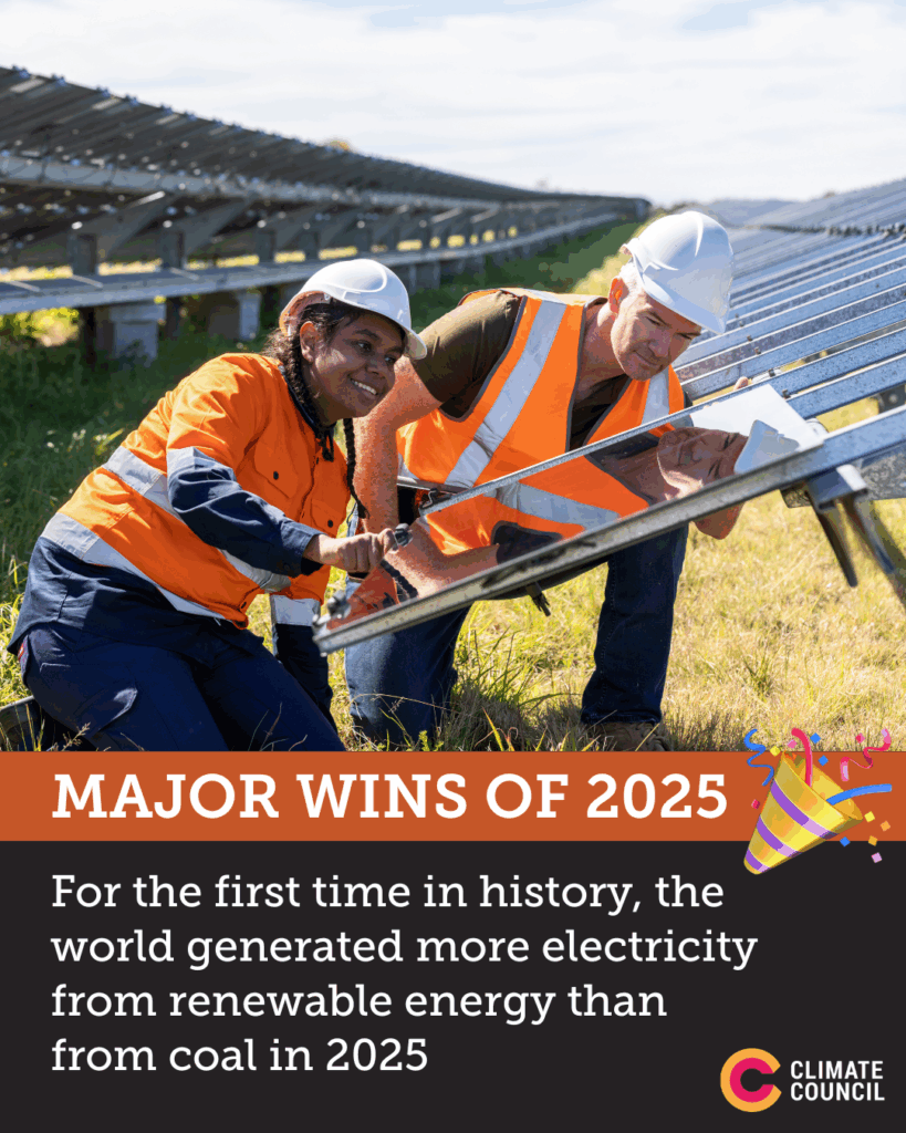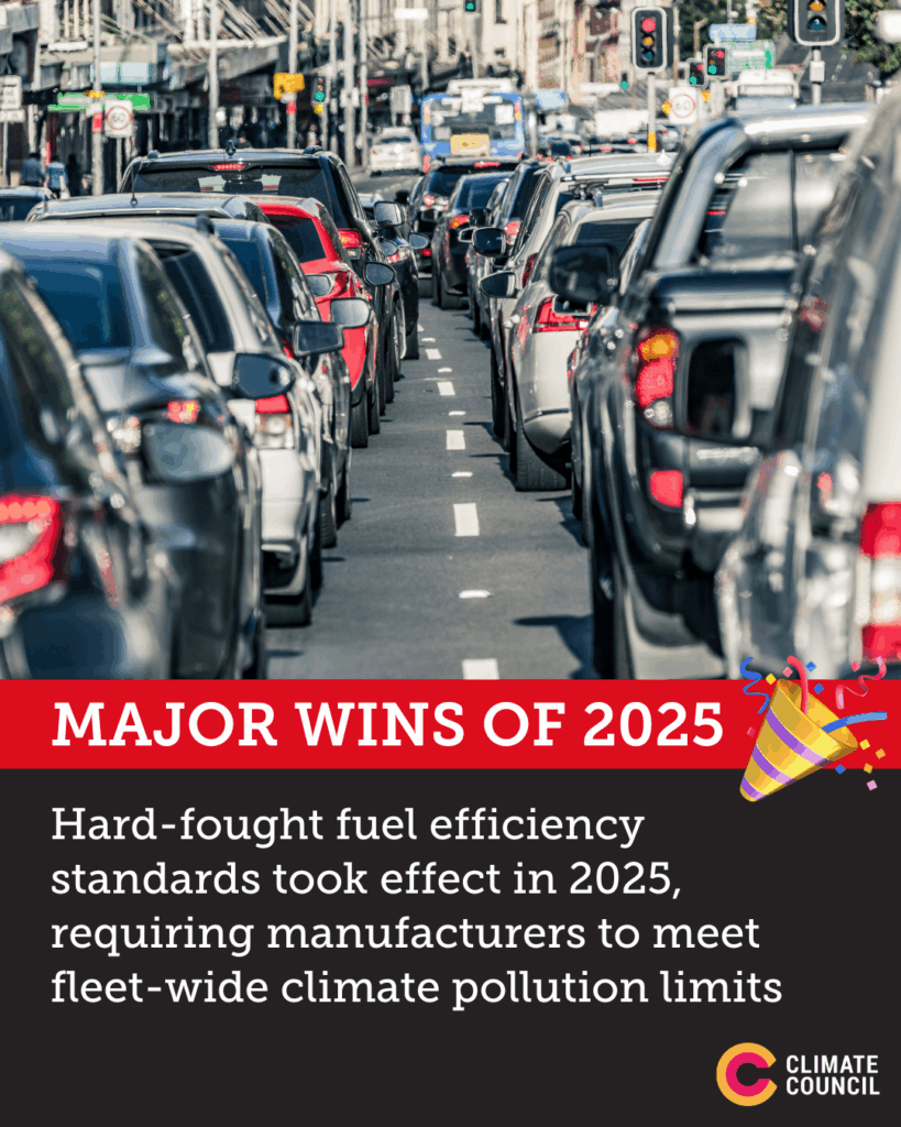 - Australia finally caught up with most of the world by implementing vehicle fuel efficiency standards – i.e stopping the most polluting cars from entering our market. These cleaner standards kicked into gear at the start of the year and will prevent 20 million tonnes of climate pollution by 2030. Meanwhile, the share of electric vehicles among new car sales in Australia has accelerated from 0.8% in 2020 to 12% in 2025.