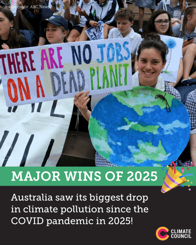 - Biggest annual drop in climate pollution outside COVID. Greenhouse gas emissions fell by 2.2% in the year to June 2025, driven by a surge in renewable energy replacing coal and gas.