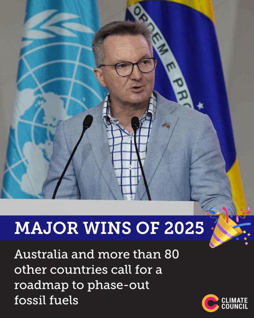 - We didn’t win the bid to host the world’s largest climate conference (COP31) next year, but we did join a growing list of countries signing up to a roadmap to phase out fossil fuels. It’s the strongest language we’ve seen from the Australian Government yet about the need to switch away from fossil fuels.