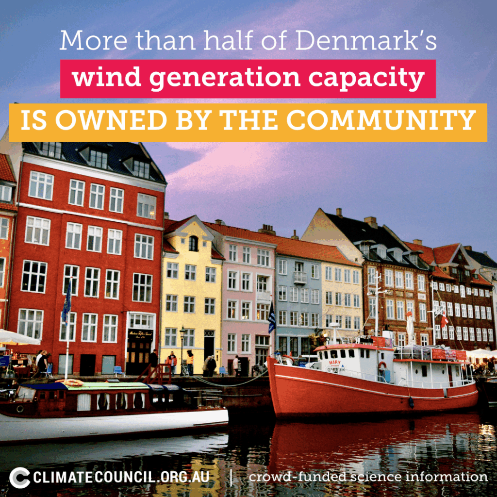 Denmark is one of the world’s renewable leaders, sourcing 88% of its power from renewable sources in 2024, and racing towards 100% by 2030. Wind alone provides 58% of the country’s power, thanks to more than 50 years of community leadership in wind projects. For nearly 15 years the Danish government has required all new wind projects to be at least 20% community owned. Now, more than half of Denmark’s wind generation capacity is owned by the community, helping to ensure its citizens benefit from the shift to renewables and building social licence for a rapid rollout.