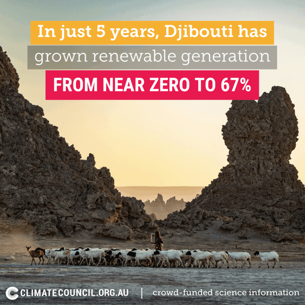 In just five years, the Djibouti in northeast Africa has grown its renewable generation from nearly zero to 67% – its first wind farm opened in just 2023. Djibouti has a target to be the first country in Africa to reach 100% renewable by 2035. It is rolling out renewables as a national priority, to reduce power prices, support its industries to grow and increase its energy independence.