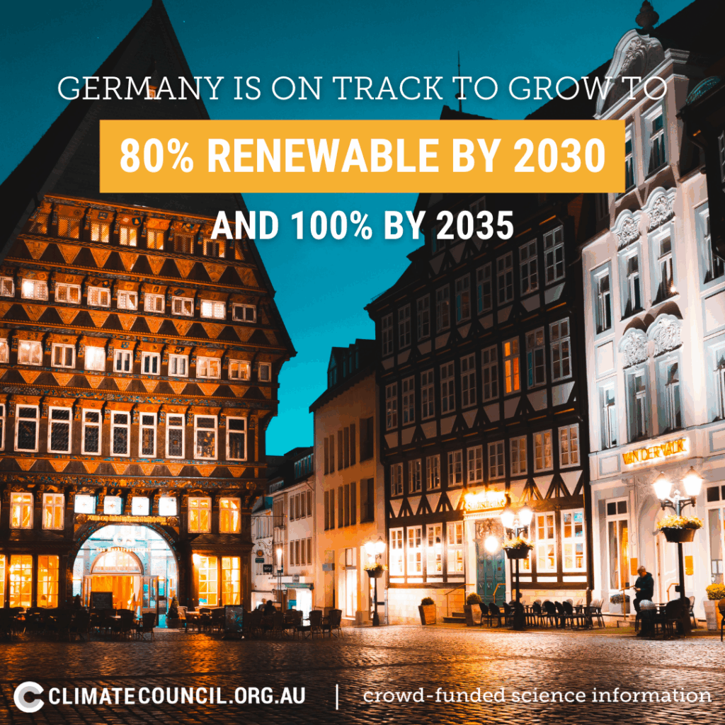 Germany currently makes around 45% of its power from renewable resources, and has targets to grow to 80% renewable by 2030, and 100% by 2035. Germany is a leader in offshore wind, and is also installing solar at record rates: on average, Germany has been installing more than 100,000 solar panels every day!