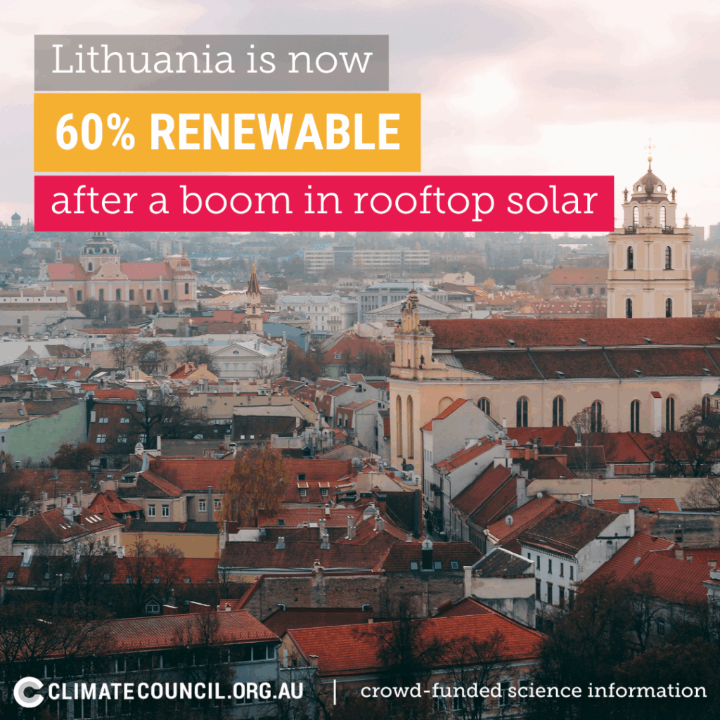 In recent years as the Russia-Ukraine war has impacted energy supply and prices worldwide, Lithuania has emerged as a renewable leader, ending its reliance on imported Russian fossil fuels in 2022. It has more than doubled its renewable generation since 2018 and is now more than 60% renewable, supported by a boom in rooftop solar. By 2030, Lithuania aims to shift from a net electricity importer to an exporter.