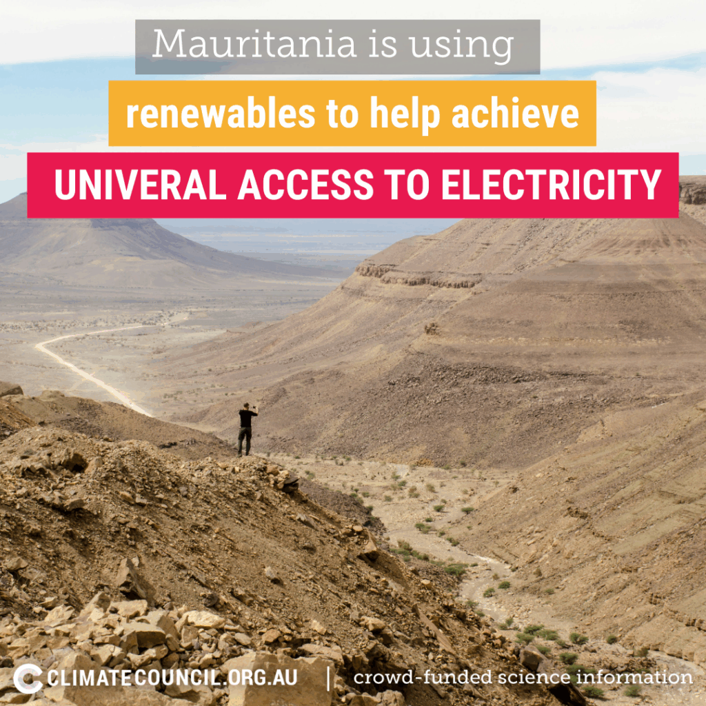 Mauritania is rapidly transforming its energy systems and economy: before 2008, the share of electricity produced from renewables was less than 1%. Now, it’s more than 50% renewable, with most of this coming from wind and solar, and is aiming to reach 70% by 2030. With fewer than 10% of rural Mauritanian households connected to electricity, renewables are a key part of the country’s goal of achieving universal access by the end of the decade.