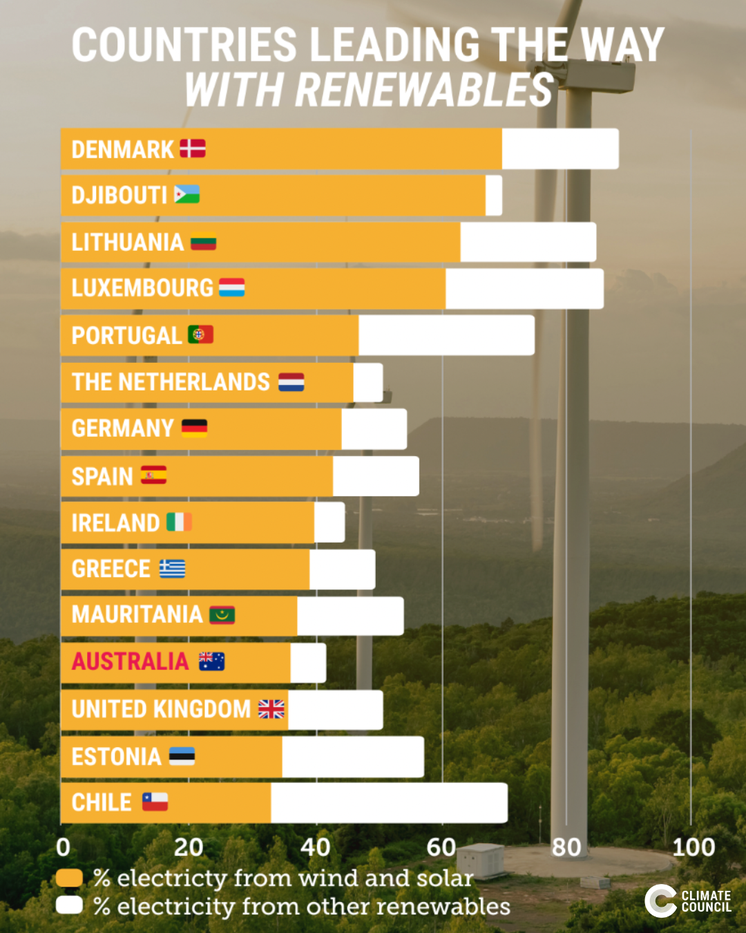 Australia currently ranks 12th place for the share of wind and solar in our main grid, despite being the sunniest and one of the windiest countries in the world.