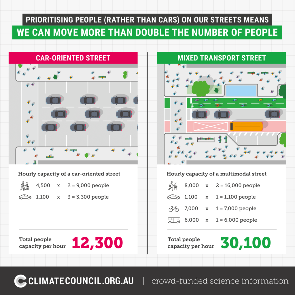 Governments can plan our cities and design our transport systems by prioritising shared and active travel as the most efficient travel options, capable of moving the most people, while taking up the least amount of space.